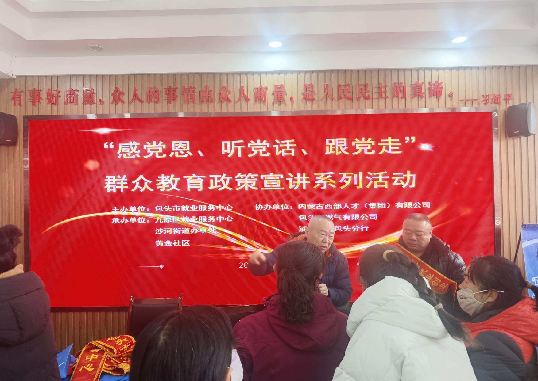 为深入宣传党的惠民政策,为辖区居民精准开展就业服务。11月28日,由包头市就业服务中心主办,九原区就业服务中心、沙河街道办事处、黄金社区共同承办的“感党恩、听党话、跟党走”群众教育政策宣讲活动在沙河街道黄金社区“家门口”就业服务站成功举行,同步联动7家企业打造“小而精、专而美”专场招聘会,将就业政策、优质岗位直接送到群众身边,以精准化服务激活基层就业市场活力。