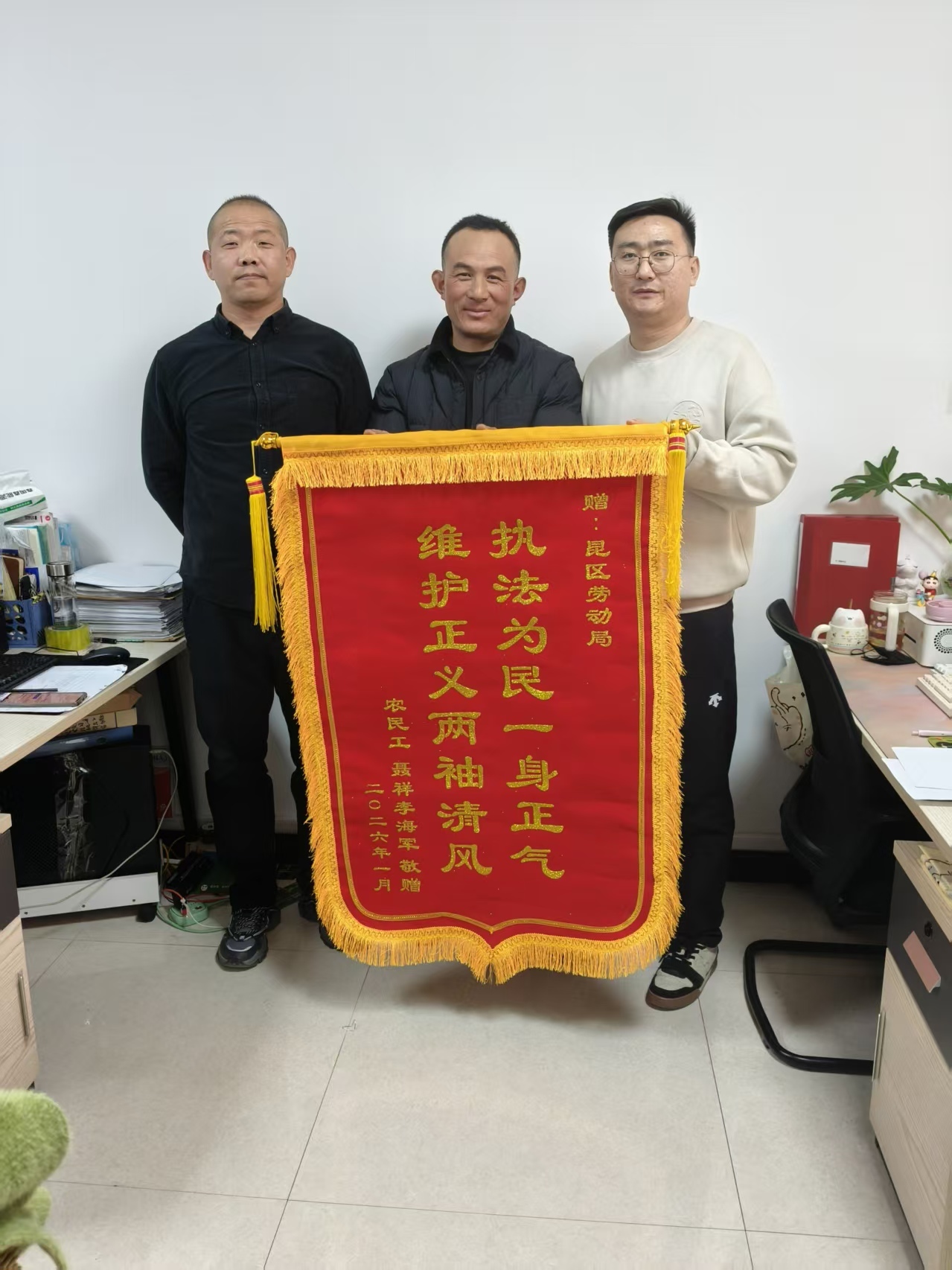 近日,聂先生与李先生将一面印有“执法为民一身正气,维护正义两袖清风”的锦旗亲手送到包头市昆都仑区劳动者维权服务中心工作人员手中,鲜红的锦旗承载着对中心高效维权、为民解忧的深切感激,也彰显了群众对我区劳动维权工作的充分认可。