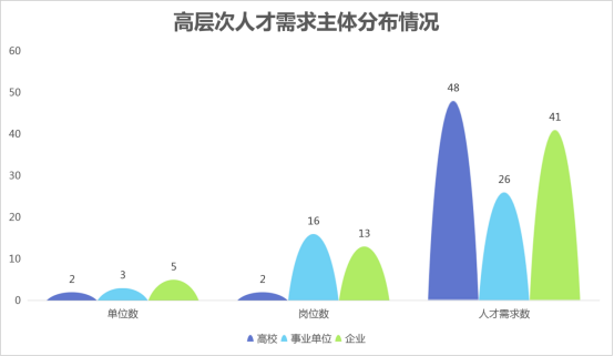 主体分布:5家事业单位申报(含2所高校),18个岗位需求74人,领军人才与杰出专家、精英人才、优秀博士、博士学位青年学者等占高层次引才总量的64.35%;企业共5家申报,均为第二产业龙头企业,13个岗位需求41人,占高层次引才总量的35.65%,体现出我市第二产业转型升级对顶尖科研人才、技术人才的迫切需求。
