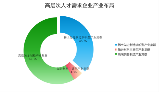 企业产业布局:按我市“1144”现代化产业体系分类,稀土先进制造旗帜型产业集群2家单位,7个岗位需求15人,占企业高层次引才总量的36.6%;先进材料主导型产业集群1家单位,1个岗位需求2人,占比4.9%;高端装备制造产业集群2家单位,5个岗位需求24人,占比58.5%。两大制造类产业集群合计占比95.1%,成为高层次人才需求的核心领域,与我市打造先进制造业基地的产业定位高度契合。
