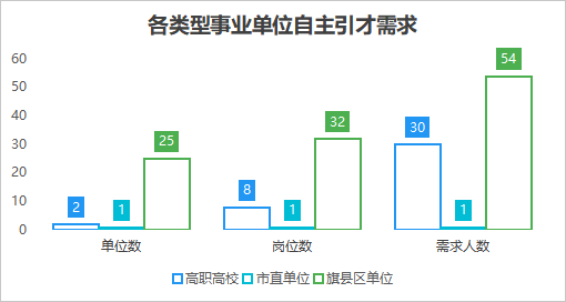 单位类型:高职高校2家,8个岗位、30人需求;市直单位1家,1个岗位、1人需求;旗县区单位25家,32个岗位、54人需求。