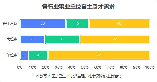 行业分布:教育行业2家,8个岗位、30人需求;医疗卫生行业4家,11个岗位、15人需求;公共管理、社会保障和社会组织行业22家,22个岗位、40人需求。