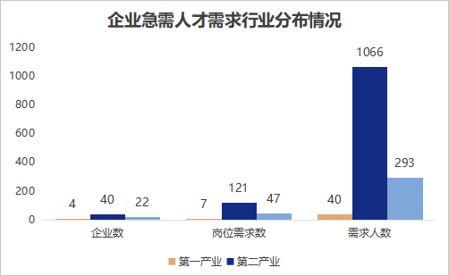 行业分布:第一产业4家单位,7个岗位需求40人,占企业引才总量的2.86%;第二产业40家单位,121个岗位需求1066人,占比76.2%,是企业人才需求的核心领域;第三产业22家单位,47个岗位需求293人,占比20.94%,充分体现出我市作为工业城市的产业特色,第二产业尤其是制造业的人才需求占据绝对主导,同时兼顾一三产业协同发展的人才需求。