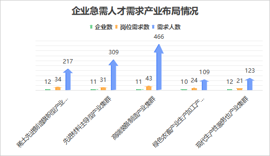 产业布局:按照我市“1144”现代化产业体系分类,各产业集群人才需求呈现出与我市产业发展重点相契合的特征:稀土先进制造旗帜型产业集群12家单位,34个岗位需求217人,占比15.51%;先进材料主导型产业集群11家单位,31个岗位需求309人,占比22.09%,为需求占比最高的产业集群;高端装备制造产业集群11家单位,43个岗位需求466人,占企业引才总量的33.31%;绿色农畜产品生产加工产业集群10家单位,24个岗位需求109人,占比7.79%;现代生产性服务业产业集群12家单位,21个岗位需求123人,占比8.79%。高端装备制造、先进材料、稀土先进制造三大产业集群合计需求992人,占企业需求总量的70.91%,成为企业急需紧缺人才的核心需求领域,彰显出我市聚焦优势特色产业打造产业集群、以人才集聚推动产业集群发展的核心思路。
