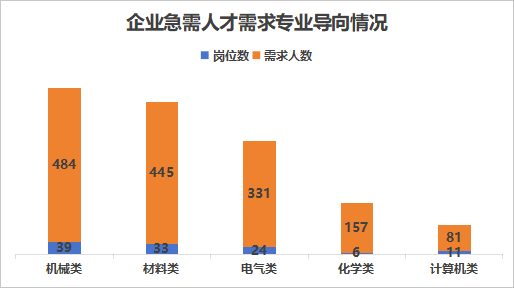 专业导向:企业急需人才需求专业集中度较高,排名前三的依次为机械、材料、电气类专业,成为产业发展的核心专业需求:机械类39个岗位需求484人,占企业引才总量的34.6%,核心需求方向为机械设计、车辆工程、机械自动化等,紧扣装备制造产业发展刚需;材料类33个岗位需求445人,占比31.8%,核心需求方向为稀土材料、金属材料、高分子材料等,与我市稀土、先进材料产业的发展特色高度契合;电气类24个岗位需求331人,占比23.66%,核心需求方向为电气自动化、电气工程等,是制造业及清洁能源产业发展的通用核心专业。此外,化学类(6个岗位157人,占比11.22%)、计算机类(11个岗位81人,占比5.79%)等专业均围绕产业技术研发、生产工艺优化设置需求,专业需求与产业发展的适配性进一步提升。
