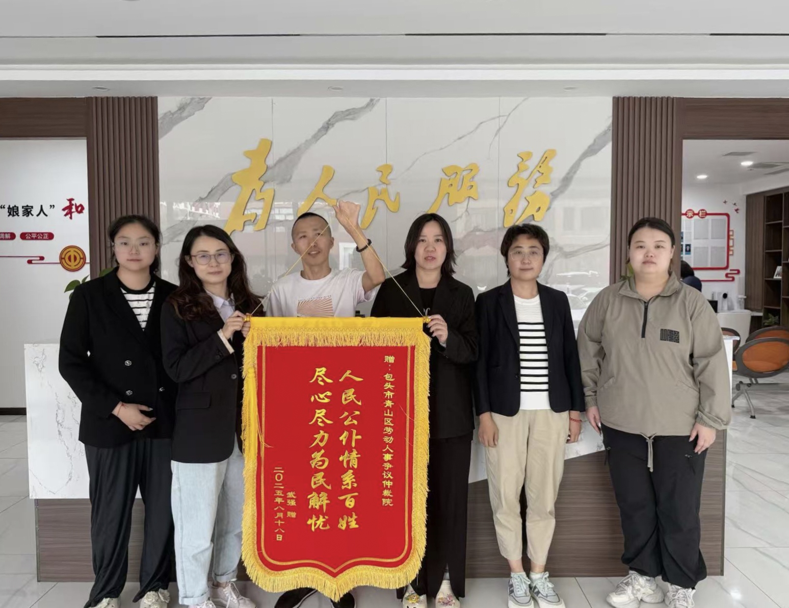 “感谢仲裁院的工作人员,要不是你们尽心尽力,我这工伤赔偿不知道要拖到什么时候……”近日,青山区劳动人事争议仲裁院的服务窗口前暖意融融,申请人武师傅将一面印着“人民公仆情系百姓,尽心尽力为民解忧”的鲜红锦旗送到仲裁员手中,用最质朴的方式表达着对仲裁院高效维权、贴心服务的感激之情。
