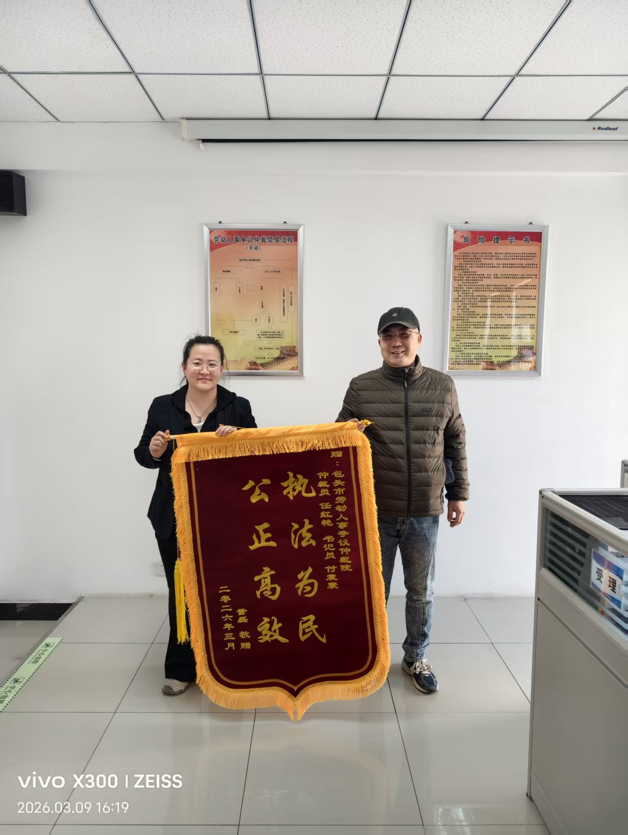 近日,在包头市劳动仲裁院审理庭办公室内,伴随着仲裁员们工作氛围紧张有序地开展,此前案件当事人董某手持一面印有“执法为民,公正高效”的锦旗步入庭室,专程向仲裁院表达谢意。